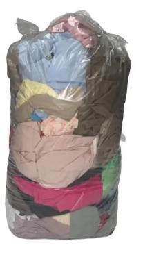 Trapos, de colores varios, provenientes de ropas en desuso compuestas por un 100% algodón, proveniente de remeras, camisetas, buzos, y demás prendas de puro algodón. Absorción excelente. Ideal para limpieza liviana y/o mediana. Sin pelusas. Se presenta en tamaños irregulares de aproximadamente 40x40cm, sin cierres ni botones.